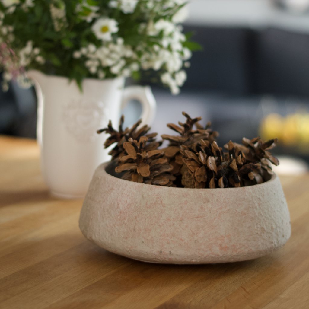 Dekorativní cementová mísa se hodí především do interiérů s přírodním, minimalistickým, industriálním stylem. Díky své hmotnosti a stabilitě je ideální na jídelní nebo konferenční stůl, kuchyňský ostrůvek, komodu, parapet nebo nízký stolek. Krásně vynikne i ve vstupní hale nebo na recepci, kde působí jako výrazný solitér. Nejlépe se uplatní na pevném a stabilním povrchu, kde může nerušeně vyniknout její struktura a jednoduchý tvar.