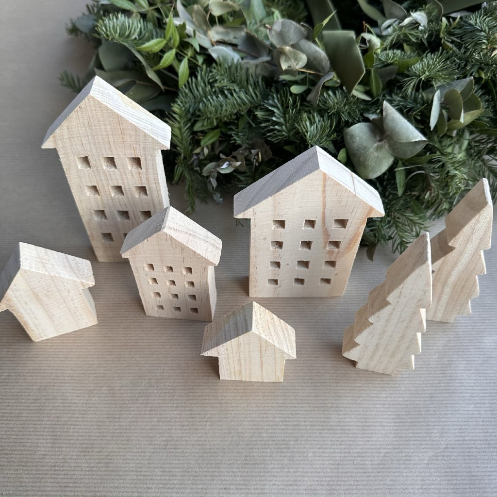 Sada dřevěných domečků a stromků k dozdobení nebo pomalování. Na domečky je možné malovat akrylovými barvami nebo fixami. Každá sada obsahuje 5 domečků a 2 stromky.