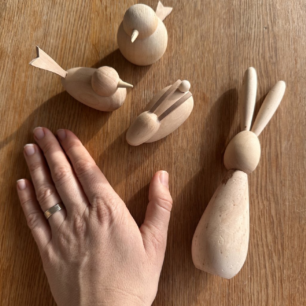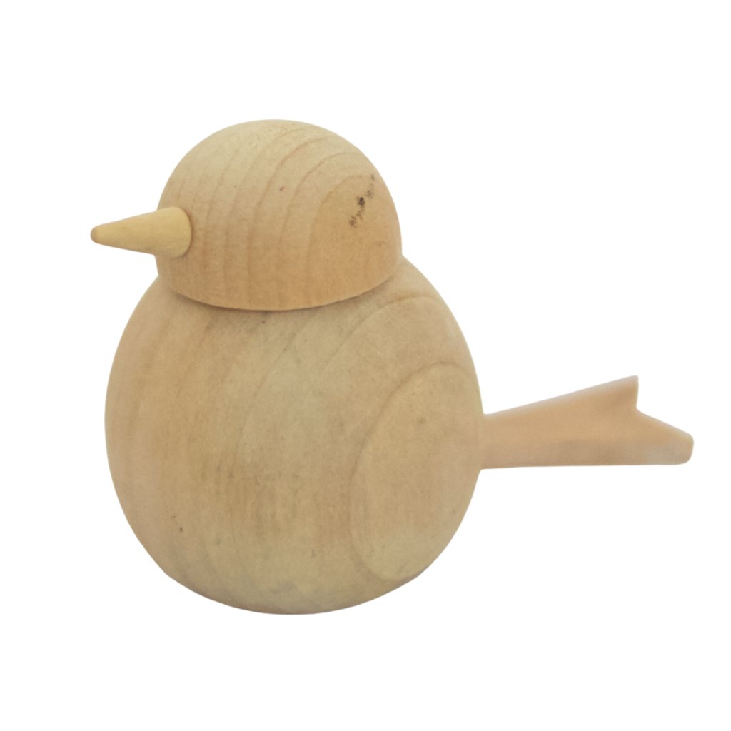 Ptáčka lze malovat akrylovými barvami, fixami, pastelkami. Přírodní dřevo umožňuje barevné i minimalistické úpravy podle vlastního stylu.