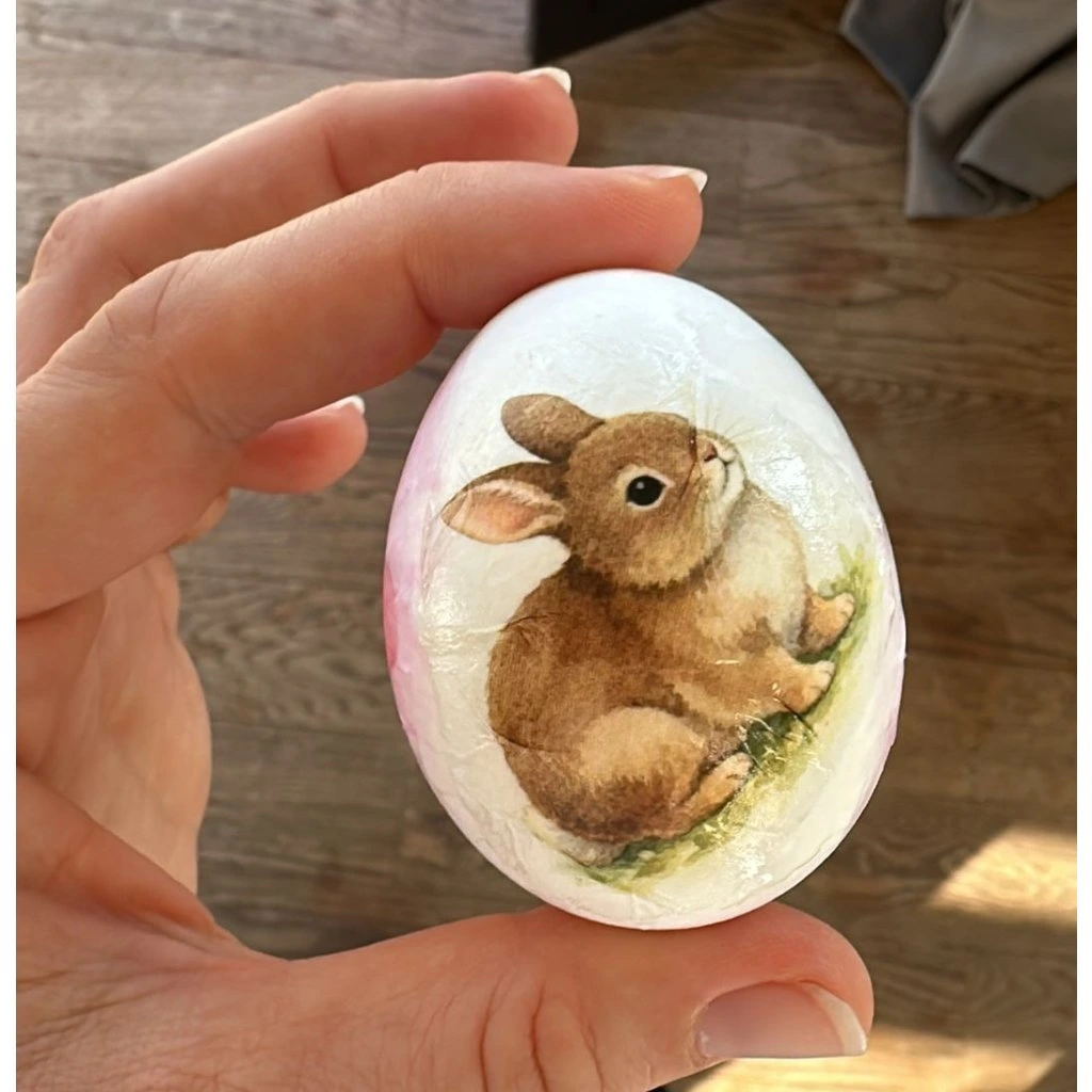 2. Z obrázku sloupněte horní folii a touto stranou, která lehce lepí, přiložte obrázek na bílou kraslici.