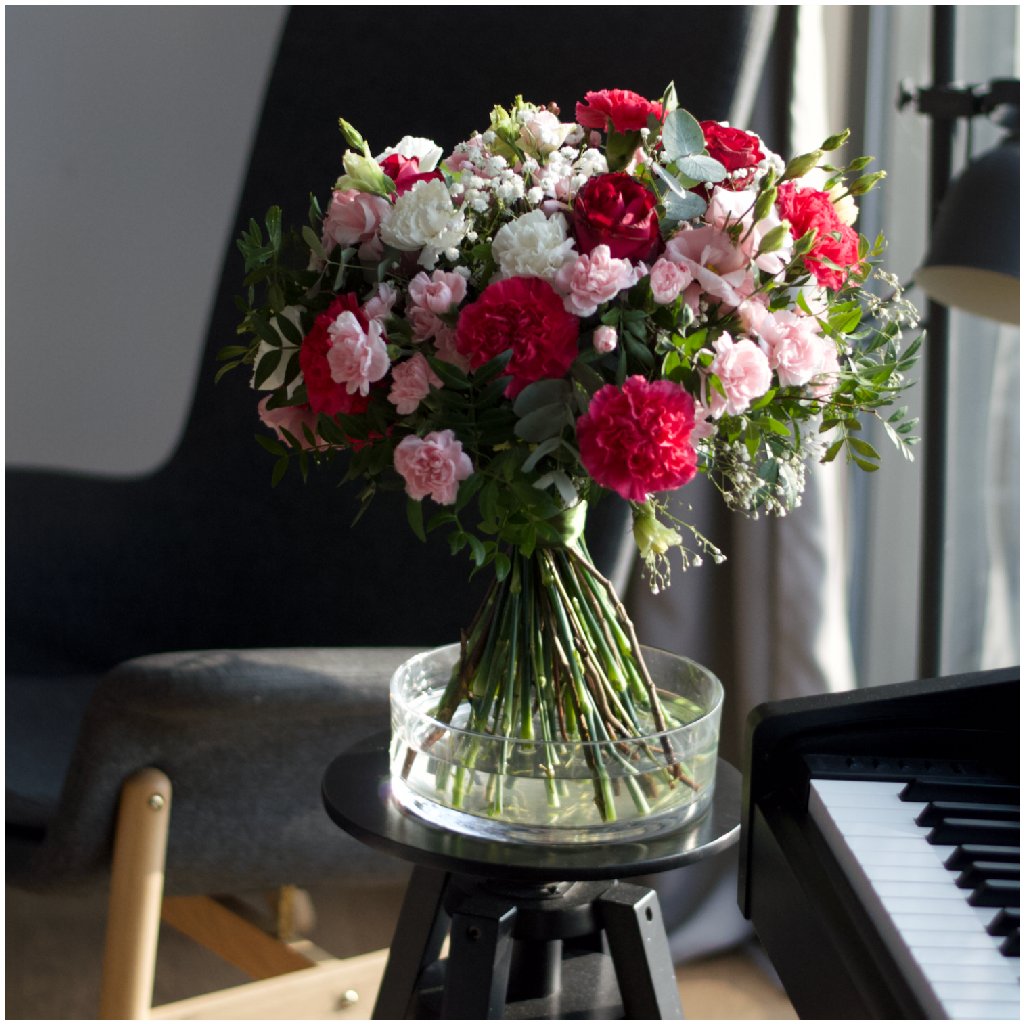 Do mísy lze umístit také kytici, kdy se do ní vsunou stonky a puget drží stabilně, přesně tak, jak je znázorněno na obrázku ve fotogalerii. Díky nízkému a širokému profilu je aranžmá dobře viditelné a zůstává elegantní a stabilní.